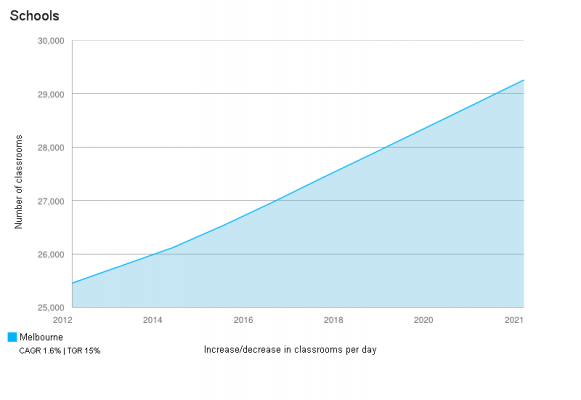 The graph below, made using the Property Council’s new tool Our Nation, shows just how many new class rooms will be needed in Melbourne to cope with projected increased numbers by 2021 – enough to make any State Government treasurer blanch.