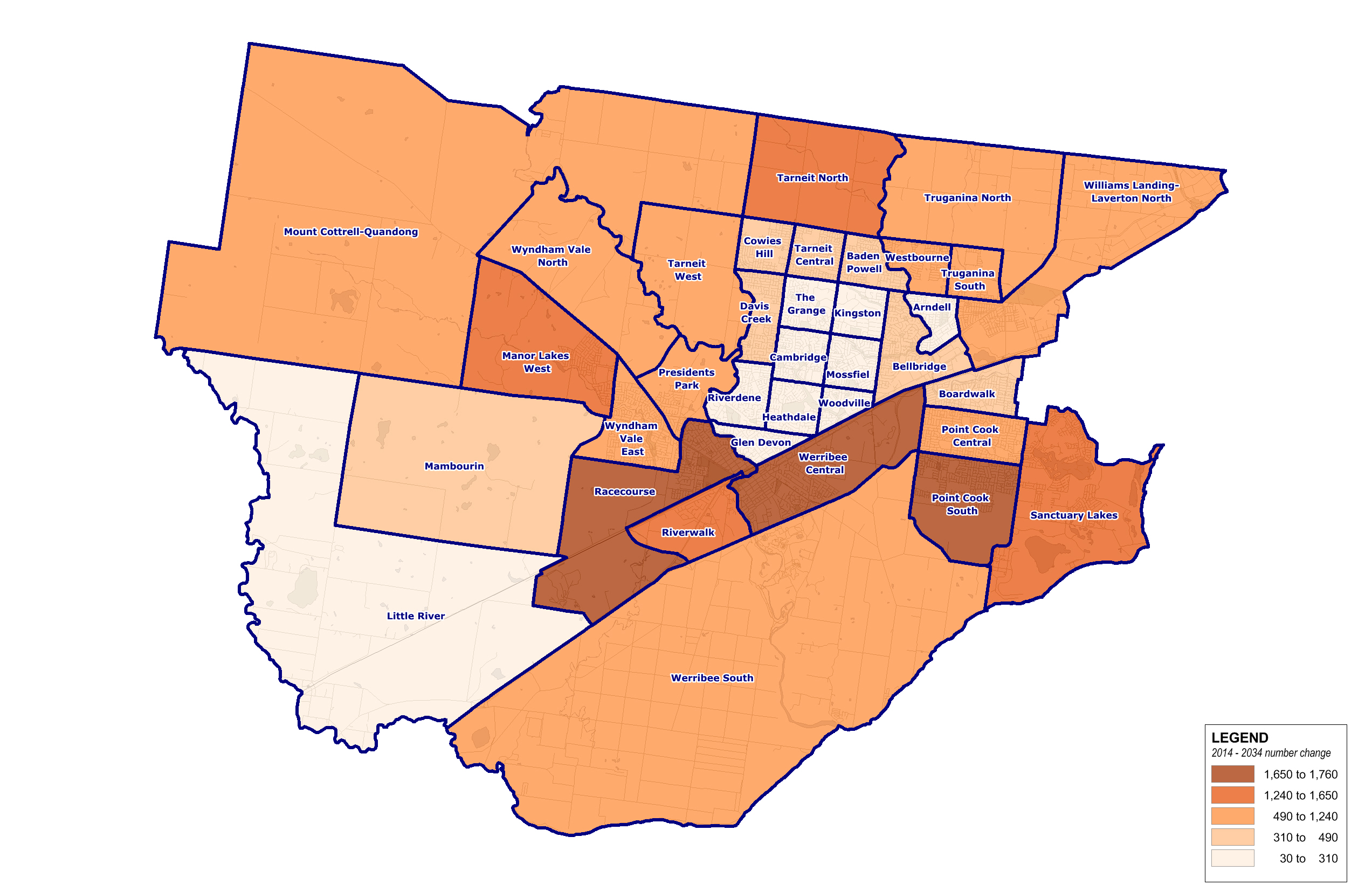 Forecast change in number of people with a need for assistance, City of Wyndham suburbs, 2014-2034