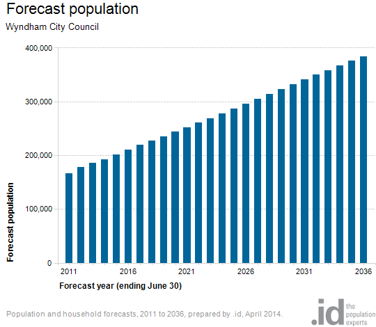 The City of Wyndham is one of Australia’s fastest growing areas. Located on Melbourne’s western fringe, it has a booming first home buyer market, due to relatively affordable housing, and plenty of land zoned for future housing growth. Young couples and families are moving there in large numbers. The population doubled between 2003 (95,000 people) and 2013 (190,000 people), and .id’s forecasts show a further doubling to 384,000 by 2036, at which time it will be one of the largest LGAs in Australia.