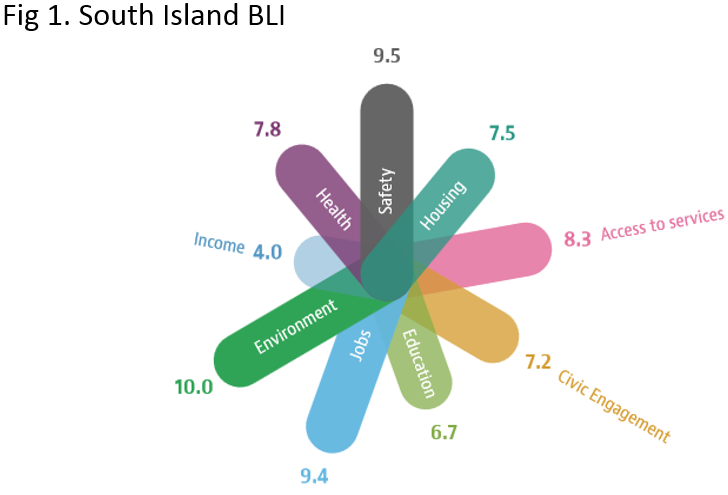 The OECD’s Better Life Index (BLI) considers wellbeing topics under two headings – material living conditions (housing, income and jobs) and quality of life (community, education, environment, governance, health, life satisfaction, safety and work-life balance). The OECD focus on member countries but also include Russia and Brazil. If you go to their website you can view the Better Life ratings for your country and in many cases area – see http://www.oecdregionalwellbeing.org/
