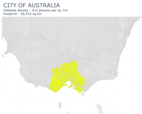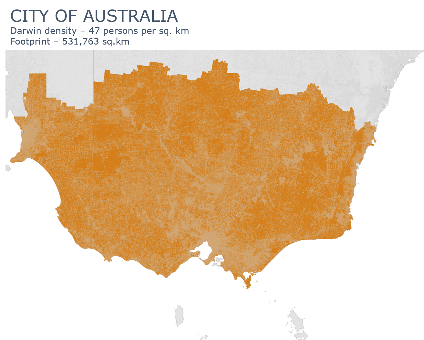 The city footprint becomes a true megalopolis when Greater Darwin’s low population density of 47 persons per square kilometre is used. At this density, a city which contains all of Australia’s population would extend east far beyond Adelaide to Petersborough in South Australia, all the way to Cowra in the north and include the entire ACT and to Kiama, almost on the doorstep to Wollongong in the west.