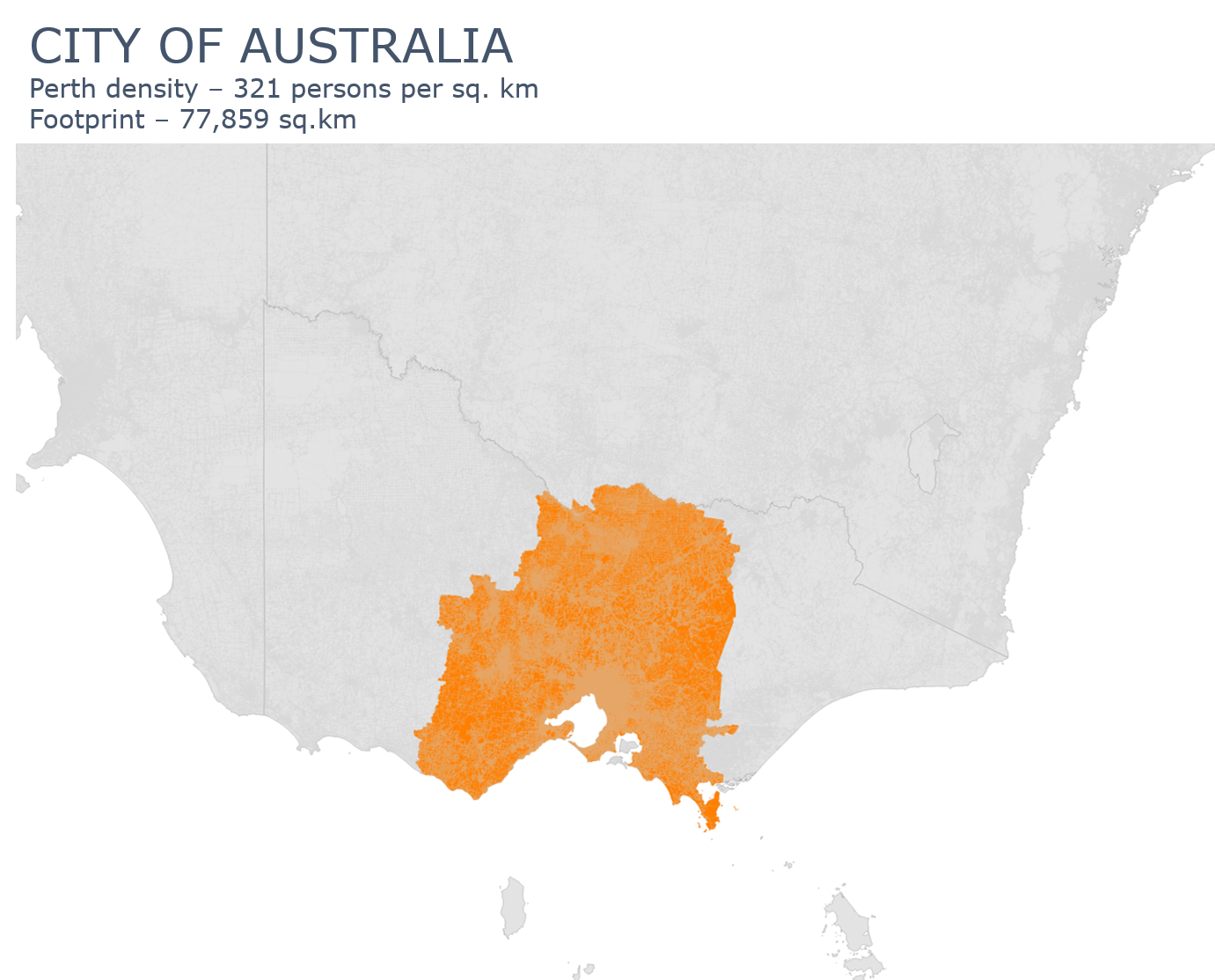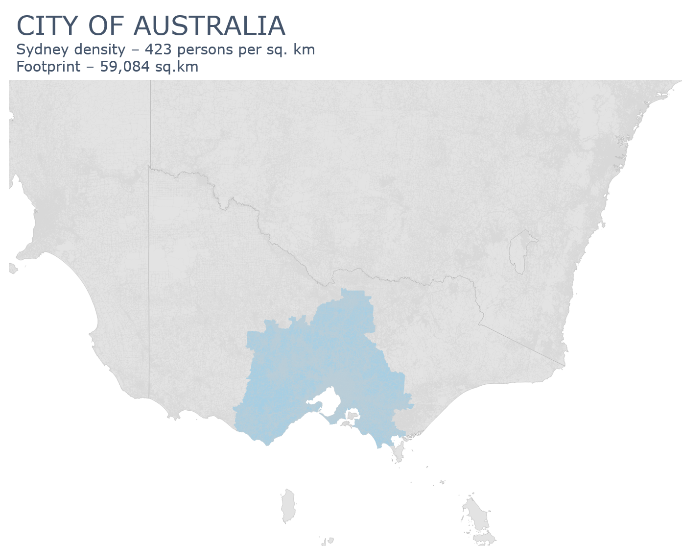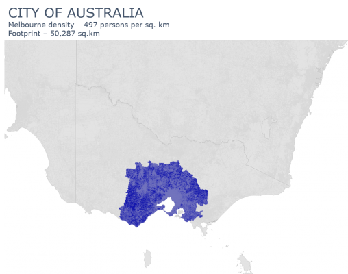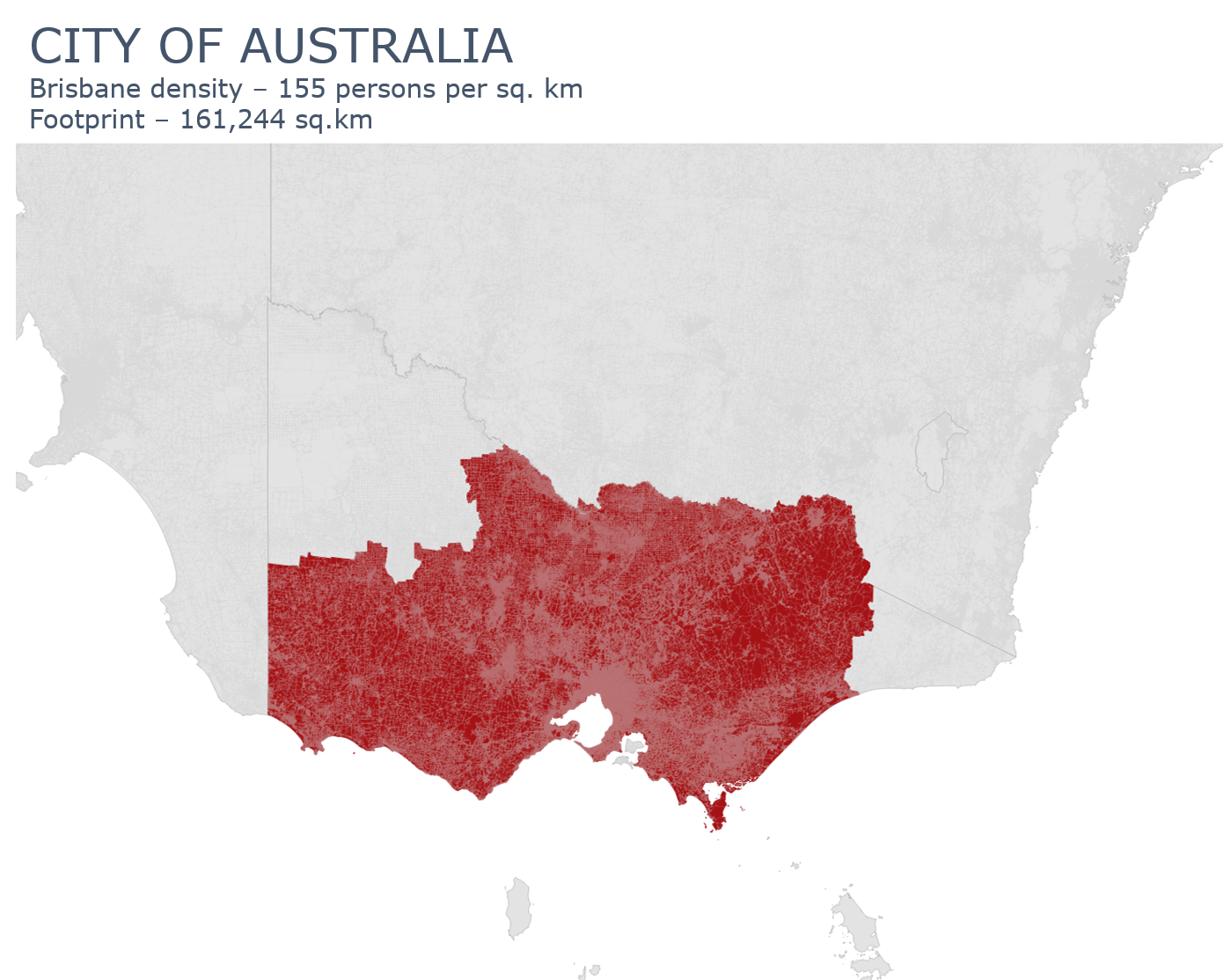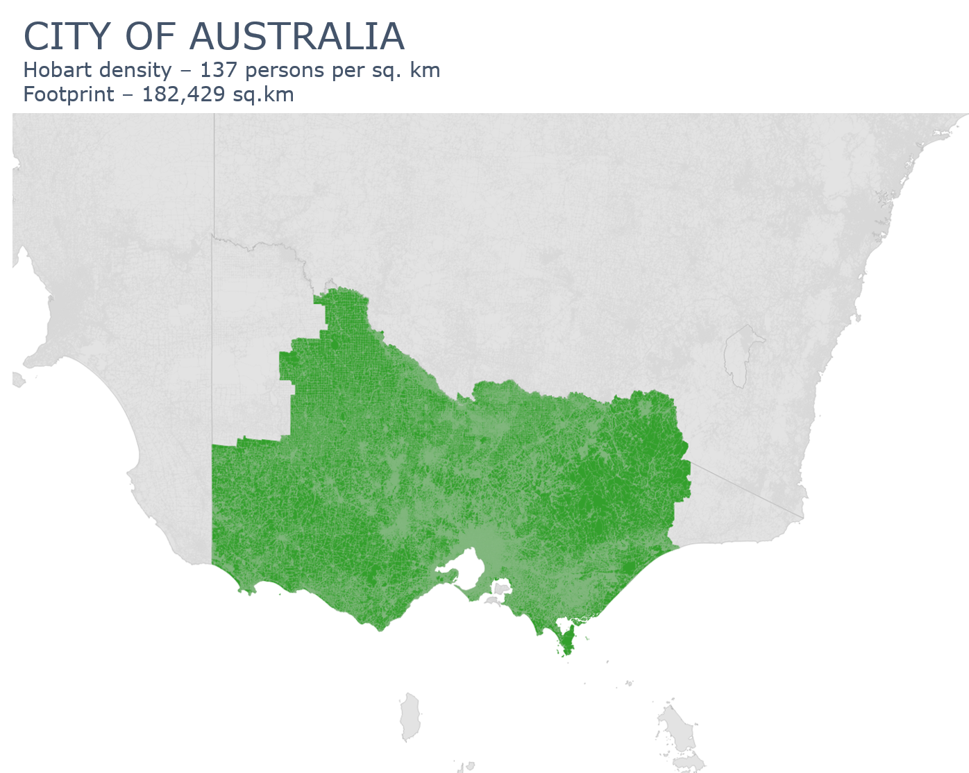 Cities with the density of Greater Melbourne (497 persons per sq. km), Sydney (423 p/sq.km ), Adelaide (413 p/sq.km) and Perth (321 p/sq.km) would all occupy similarly sized footprints, approximately extending to Shepparton, Cobram or even Echuca in the north, Camperdown in the east and Traralgon in the west.